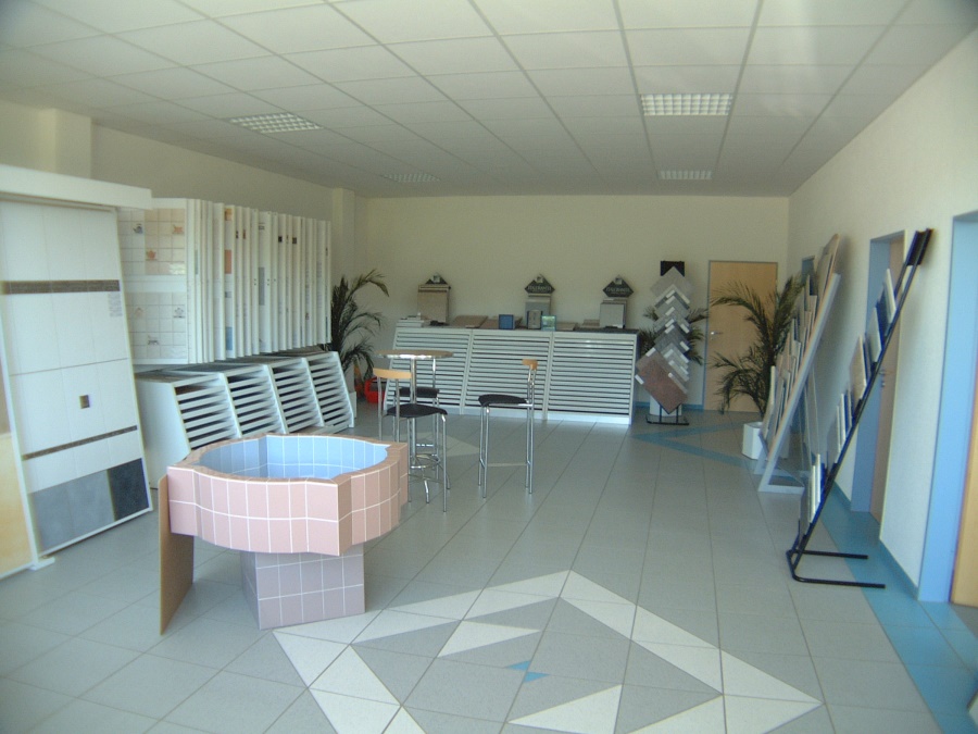 Im gewerblichen Teil des Gebäudes befinden sich eine Lagerhalle für Landwirtschaft , die über die großen Zufahrtstore erreicht wird, Ausstellungsräume für die Präsentation von Fliesenmaterialien und der Bürobereich. Im Obergeschoss ist eine Wohnung integriert.