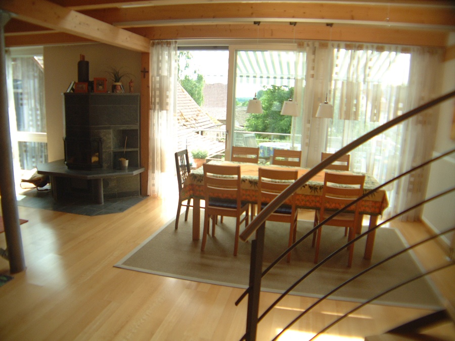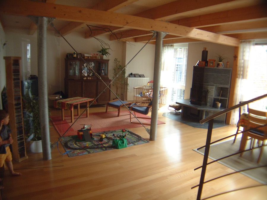 In das bestehende Ökonomiegebäude wurde eine großzügige Wohnung eingeplant. Neue Holzbalkendecken mussten eingezogen werden. Filigrane Stahlteile wie Stützen und Abstrebungen ermöglichen Durchblicke und sind wirtschaftlich bei der Lastabtragung.