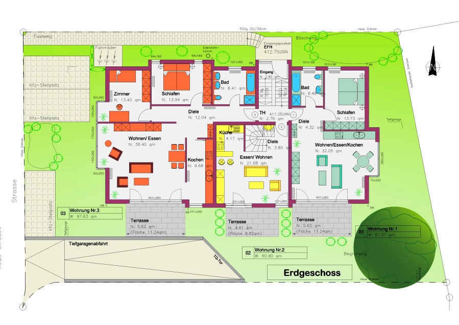 In zentraler Lage im Ortskern von Allensbach, unterhalb des Höhrenbergs, entstand eine familienfreundliche Wohnanlage mit einem Mehrfamilien Wohnhaus und 2 Doppelhäusern. Im Rückwärtigen Bereich des Grundstücks entstand ein Wohnhaus mit sechs unterschiedlich großen Wohnungen. Im Kellergeschoss ist eine zentrale Tiefgarage mit großzügig erreichbaren Stellplätzen und Sonderflächen für Fahrräder, Kinderwagen und dergleichen. Die Wohnungen sind sinnvoll und Kundenorientiert organisiert. Lichtdurchflutete Räume durch großzügige Fensterflächen.